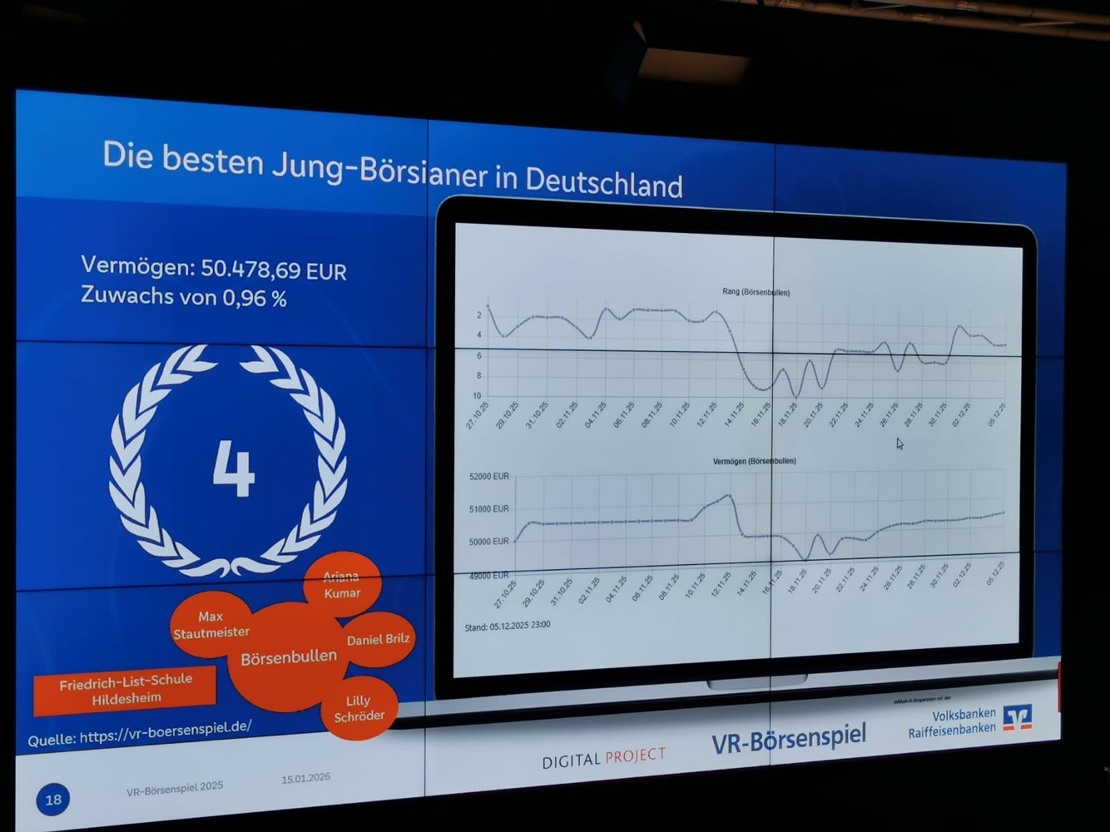 Das Börsenspiel der Hannoversche Volksbank eG fand in diesem Jahr vom 27. Oktober bis zum 5. Dezember 2025 statt. Teilnehmerinnen und Teilnehmer im Alter von etwa 14 bis 22 Jahren waren eingeladen, mit einem virtuellen Startkapital von 50.000 Euro ein eigenes Depot aufzubauen und durch geschickte Anlageentscheidungen Gewinne zu erwirtschaften – ganz ohne echtes Risiko.